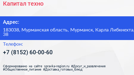 Капитал техно по адресу 183038, Мурманская область, Мурманск, Карла Либкнехта, 38 в дальнейшем Организация, размещена в следующих категориях:
