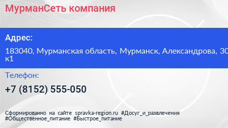 МурманСеть, компания по адресу 183040, Мурманская область, Мурманск, Александрова, 30 к1 в дальнейшем Организация, размещена в следующих категориях:
