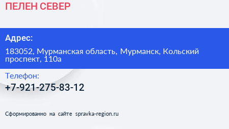 ПЕЛЕН СЕВЕР по адресу 183052, Мурманская область, Мурманск, Кольский проспект, 110а в дальнейшем Организация, размещена в следующих категориях:
