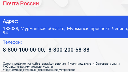 Почта России по адресу 183038, Мурманская область, Мурманск, проспект Ленина, 94 в дальнейшем Организация, размещена в следующих категориях:
