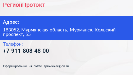 РегионПротэкт по адресу 183052, Мурманская область, Мурманск, Кольский проспект, 55 в дальнейшем Организация, размещена в следующих категориях: