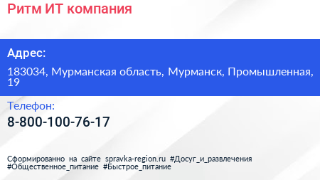 Ритм-ИТ, компания по адресу 183034, Мурманская область, Мурманск, Промышленная, 19 в дальнейшем Организация, размещена в следующих категориях: