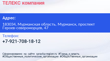 ТЕЛЕКС, компания по адресу 183034, Мурманская область, Мурманск, проспект Героев-североморцев, 47 в дальнейшем Организация, размещена в следующих категориях: