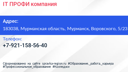 IT ПРОФИ, компания по адресу 183038, Мурманская область, Мурманск, Воровского, 5/23 в дальнейшем Организация, размещена в следующих категориях:
