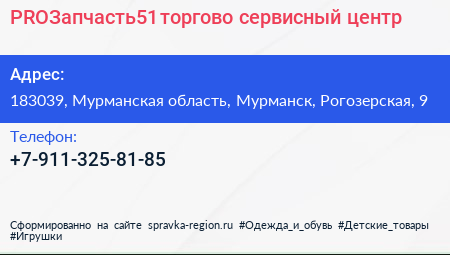 PROЗапчасть51, торгово-сервисный центр по адресу 183039, Мурманская область, Мурманск, Рогозерская, 9 в дальнейшем Организация, размещена в следующих категориях: