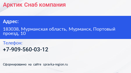 Арктик Снаб, компания по адресу 183038, Мурманская область, Мурманск, Портовый проезд, 10 в дальнейшем Организация, размещена в следующих категориях: