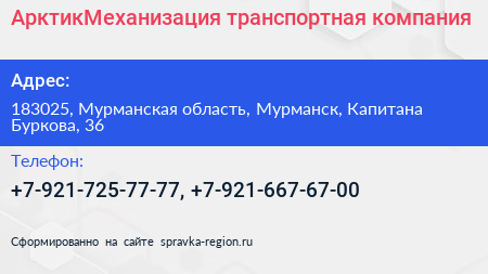 АрктикМеханизация, транспортная компания по адресу 183025, Мурманская область, Мурманск, Капитана Буркова, 36 в дальнейшем Организация, размещена в следующих категориях: