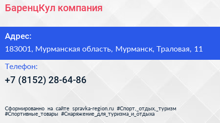БаренцКул, компания по адресу 183001, Мурманская область, Мурманск, Траловая, 11 в дальнейшем Организация, размещена в следующих категориях: