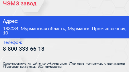 ЧЭМЗ, завод по адресу 183034, Мурманская область, Мурманск, Промышленная, 10 в дальнейшем Организация, размещена в следующих категориях: