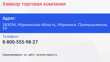 Химкор, торговая компания по адресу 183034, Мурманская область, Мурманск, Промышленная, 19 в дальнейшем Организация, размещена в следующих категориях: