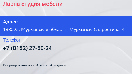 Лавна, студия мебели по адресу 183025, Мурманская область, Мурманск, Старостина, 4 в дальнейшем Организация, размещена в следующих категориях: