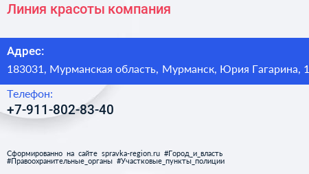 Линия красоты, компания по адресу 183031, Мурманская область, Мурманск, Юрия Гагарина, 1 в дальнейшем Организация, размещена в следующих категориях: