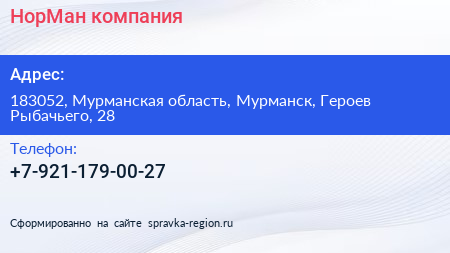 НорМан, компания по адресу 183052, Мурманская область, Мурманск, Героев Рыбачьего, 28 в дальнейшем Организация, размещена в следующих категориях: