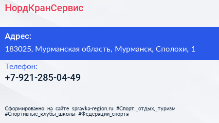 НордКранСервис по адресу 183025, Мурманская область, Мурманск, Сполохи, 1 в дальнейшем Организация, размещена в следующих категориях:
