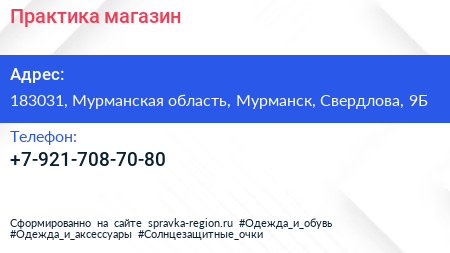 Практика, магазин по адресу 183031, Мурманская область, Мурманск, Свердлова, 9Б в дальнейшем Организация, размещена в следующих категориях: