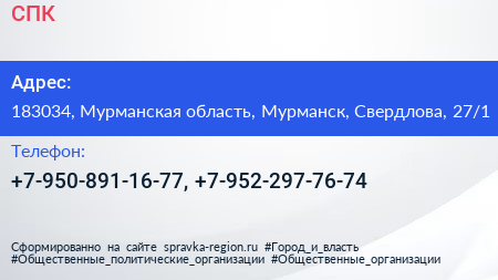 СПК по адресу 183034, Мурманская область, Мурманск, Свердлова, 27/1 в дальнейшем Организация, размещена в следующих категориях: