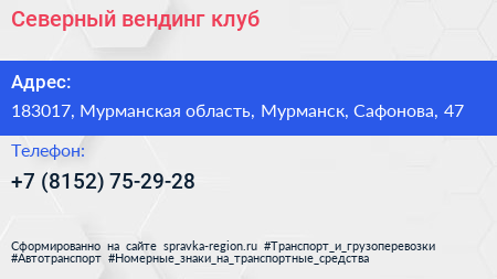 Северный вендинг клуб по адресу 183017, Мурманская область, Мурманск, Сафонова, 47 в дальнейшем Организация, размещена в следующих категориях: