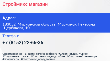 Строймикс, магазин по адресу 183052, Мурманская область, Мурманск, Генерала Щербакова, 10 в дальнейшем Организация, размещена в следующих категориях: