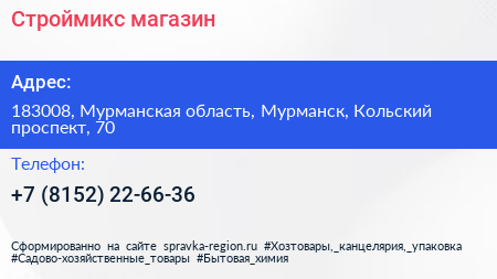 Строймикс, магазин по адресу 183008, Мурманская область, Мурманск, Кольский проспект, 70 в дальнейшем Организация, размещена в следующих категориях:
