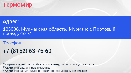ТермоМир по адресу 183038, Мурманская область, Мурманск, Портовый проезд, 46 к1 в дальнейшем Организация, размещена в следующих категориях: