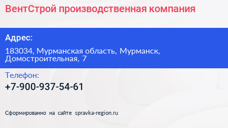 ВентСтрой, производственная компания по адресу 183034, Мурманская область, Мурманск, Домостроительная, 7 в дальнейшем Организация, размещена в следующих категориях: