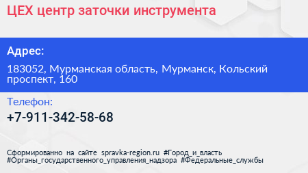 ЦЕХ, центр заточки инструмента по адресу 183052, Мурманская область, Мурманск, Кольский проспект, 160 в дальнейшем Организация, размещена в следующих категориях: