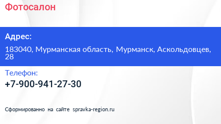 Фотосалон по адресу 183040, Мурманская область, Мурманск, Аскольдовцев, 28 в дальнейшем Организация, размещена в следующих категориях: