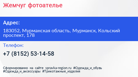 Жемчуг, фотоателье по адресу 183052, Мурманская область, Мурманск, Кольский проспект, 178 в дальнейшем Организация, размещена в следующих категориях: