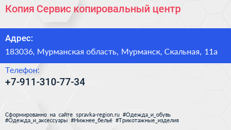 Копия-Сервис, копировальный центр по адресу 183036, Мурманская область, Мурманск, Скальная, 11а в дальнейшем Организация, размещена в следующих категориях: