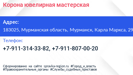 Корона, ювелирная мастерская по адресу 183025, Мурманская область, Мурманск, Карла Маркса, 29 в дальнейшем Организация, размещена в следующих категориях: