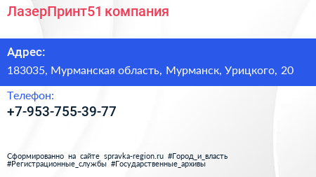 ЛазерПринт51, компания по адресу 183035, Мурманская область, Мурманск, Урицкого, 20 в дальнейшем Организация, размещена в следующих категориях: