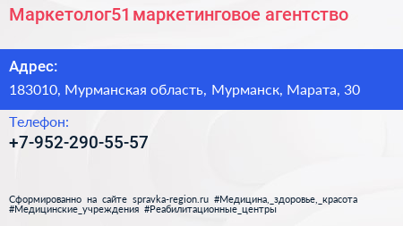 Маркетолог51, маркетинговое агентство по адресу 183010, Мурманская область, Мурманск, Марата, 30 в дальнейшем Организация, размещена в следующих категориях: