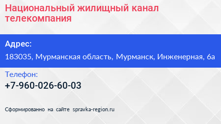 Национальный жилищный канал, телекомпания по адресу 183035, Мурманская область, Мурманск, Инженерная, 6а в дальнейшем Организация, размещена в следующих категориях: