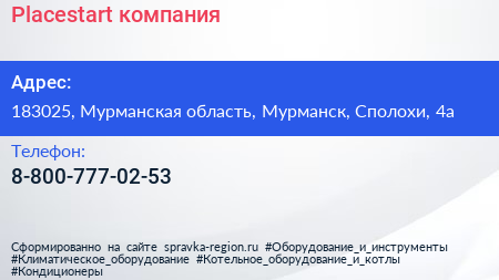 Placestart, компания по адресу 183025, Мурманская область, Мурманск, Сполохи, 4а в дальнейшем Организация, размещена в следующих категориях: