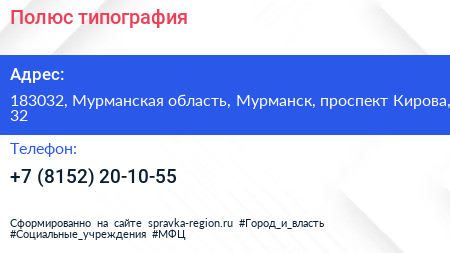 Полюс, типография по адресу 183032, Мурманская область, Мурманск, проспект Кирова, 32 в дальнейшем Организация, размещена в следующих категориях: