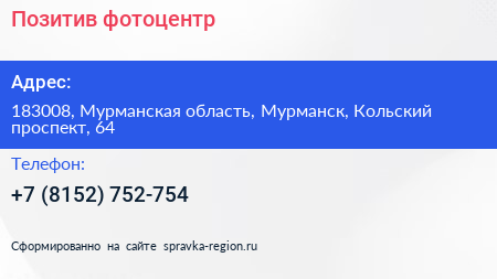 Позитив, фотоцентр по адресу 183008, Мурманская область, Мурманск, Кольский проспект, 64 в дальнейшем Организация, размещена в следующих категориях: