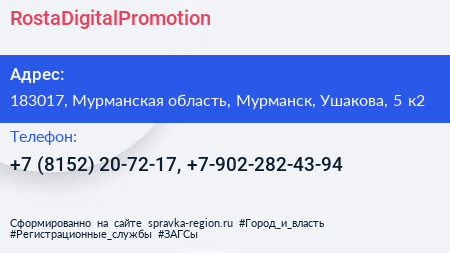 RostaDigitalPromotion по адресу 183017, Мурманская область, Мурманск, Ушакова, 5 к2 в дальнейшем Организация, размещена в следующих категориях:
