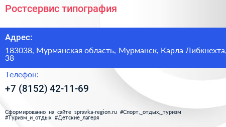Ростсервис, типография по адресу 183038, Мурманская область, Мурманск, Карла Либкнехта, 38 в дальнейшем Организация, размещена в следующих категориях: