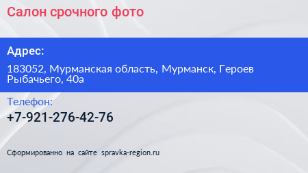 Салон срочного фото по адресу 183052, Мурманская область, Мурманск, Героев Рыбачьего, 40а в дальнейшем Организация, размещена в следующих категориях:
