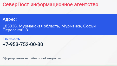 СеверПост, информационное агентство по адресу 183038, Мурманская область, Мурманск, Софьи Перовской, 8 в дальнейшем Организация, размещена в следующих категориях: