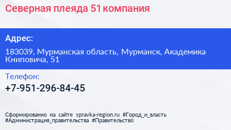 Северная плеяда 51, компания по адресу 183039, Мурманская область, Мурманск, Академика Книповича, 51 в дальнейшем Организация, размещена в следующих категориях: