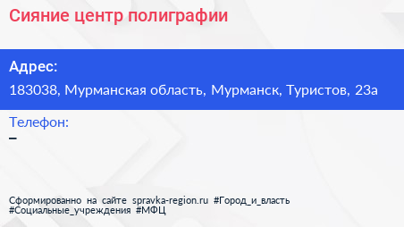 Сияние, центр полиграфии по адресу 183038, Мурманская область, Мурманск, Туристов, 23а в дальнейшем Организация, размещена в следующих категориях: