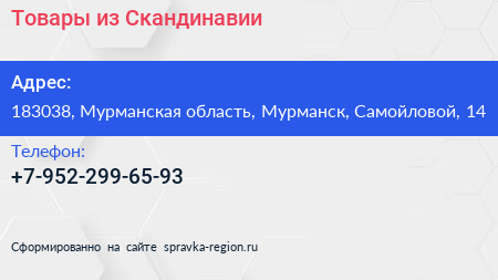 Товары из Скандинавии по адресу 183038, Мурманская область, Мурманск, Самойловой, 14 в дальнейшем Организация, размещена в следующих категориях:
