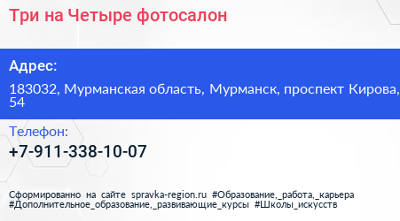 Три на Четыре, фотосалон по адресу 183032, Мурманская область, Мурманск, проспект Кирова, 54 в дальнейшем Организация, размещена в следующих категориях: