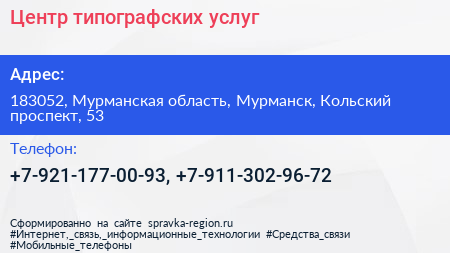 Центр типографских услуг по адресу 183052, Мурманская область, Мурманск, Кольский проспект, 53 в дальнейшем Организация, размещена в следующих категориях: