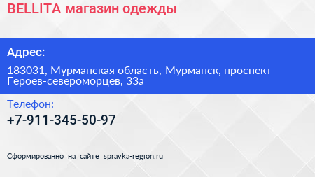 BELLITA, магазин одежды по адресу 183031, Мурманская область, Мурманск, проспект Героев-североморцев, 33а в дальнейшем Организация, размещена в следующих категориях: