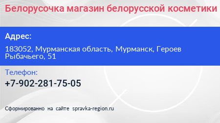 Белорусочка, магазин белорусской косметики по адресу 183052, Мурманская область, Мурманск, Героев Рыбачьего, 51 в дальнейшем Организация, размещена в следующих категориях: