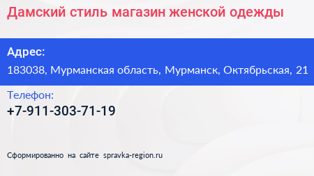 Дамский стиль, магазин женской одежды по адресу 183038, Мурманская область, Мурманск, Октябрьская, 21 в дальнейшем Организация, размещена в следующих категориях: