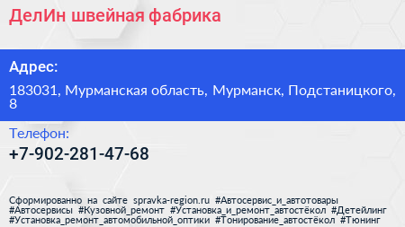 ДелИн, швейная фабрика по адресу 183031, Мурманская область, Мурманск, Подстаницкого, 8 в дальнейшем Организация, размещена в следующих категориях: