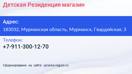 Детская Резиденция, магазин по адресу 183032, Мурманская область, Мурманск, Гвардейская, 3 в дальнейшем Организация, размещена в следующих категориях: